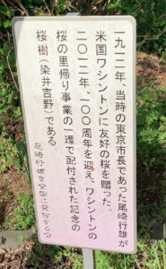 こちらのソメイヨシノは100周年の際に米国より里帰りした四種のサクラの中の一つ。普賢象、関山、ソメイヨシノと三種までは確認できましたが、あと一種は残念ながら確認できず(>ω<、)