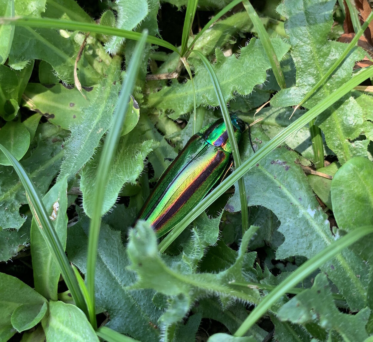 草間に落下したタマムシ。この後すぐ飛んでいきました。今年はタマムシとの遭遇率高い。