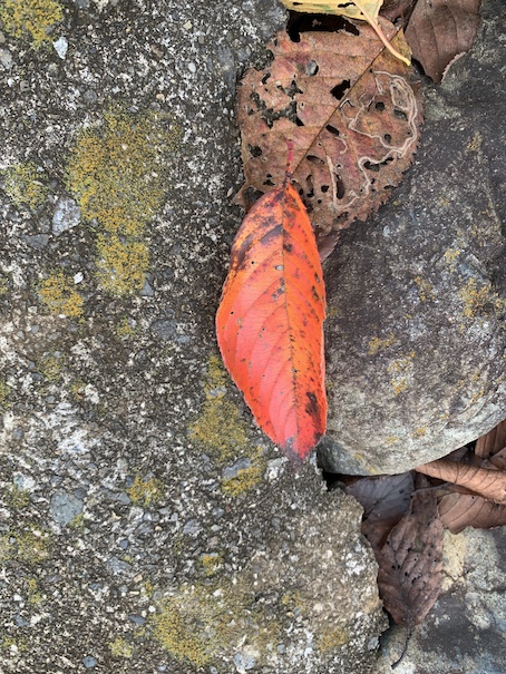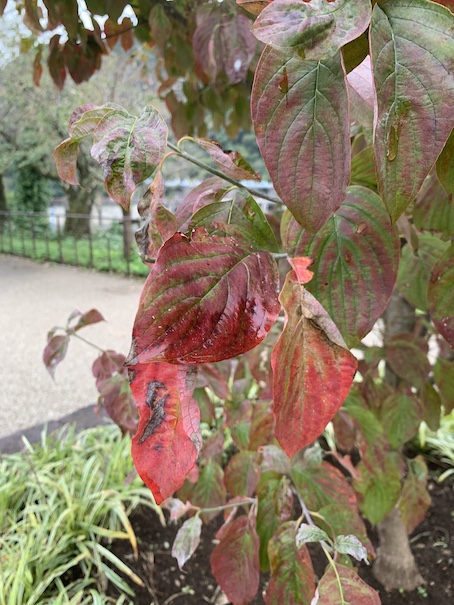 ここのところ急に冷え込むようになって紅葉もよく見かけるようになりました。こちらはハナミズキの葉。