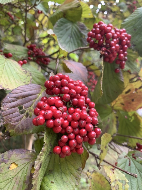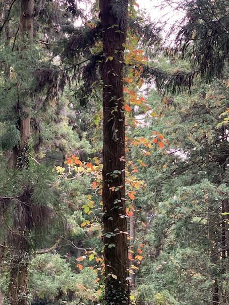 杉の幹で紅葉しているツタウルシ。有毒で皮膚の弱い人は近くを通るだけでもかぶれるそうです。まじか。