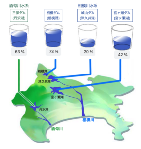 かながわの水がめ 県内の貯水状況より参照。津久井湖の水位がついに20%を割り込みそうなほど低下しています。宮ヶ瀬も42%と低めです。津久井湖の上流にあたる相模ダム(相模湖)が73%とそれほど下がっていないのが救いです。