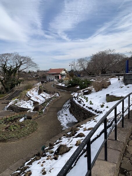 こちらは花の園地。花壇はまだ雪が残ってます。