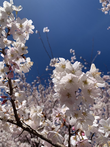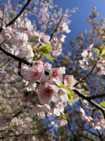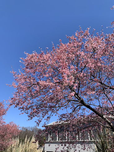 こちらのソメイヨシノに似た色合いの桜はハルメキザクラ。ソメイヨシノよりコンパクトな樹高です。