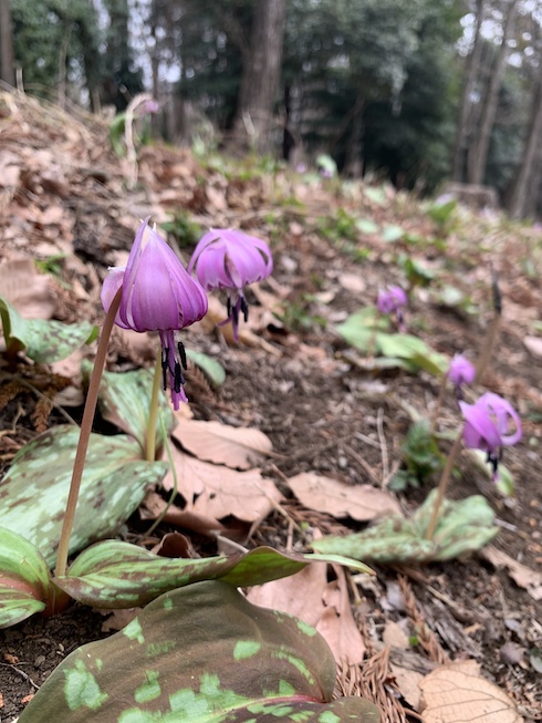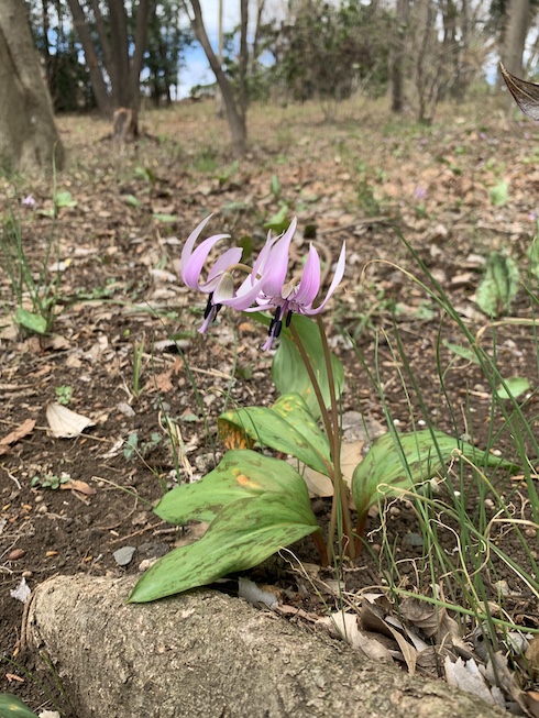 相模原北公園のカタクリが見ごろを迎えました。北公園では珍しい一株で二輪咲きの株。右の方のひょろひょろした緑の草はノビルかな?根っこ食べられるやつ。