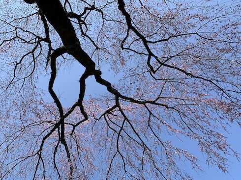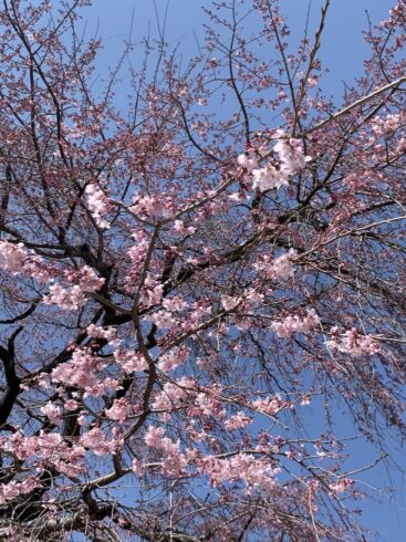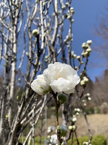 花桃の花が咲き始めていました。上に伸びるホウキ性の照手姫のハナモモですね。