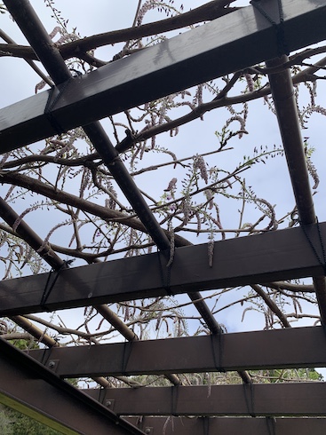 パークセンターの藤棚。だいぶ花芽が伸びてきました。市街地の藤は満開のところもありますがパークセンターは若干ゆっくり目。