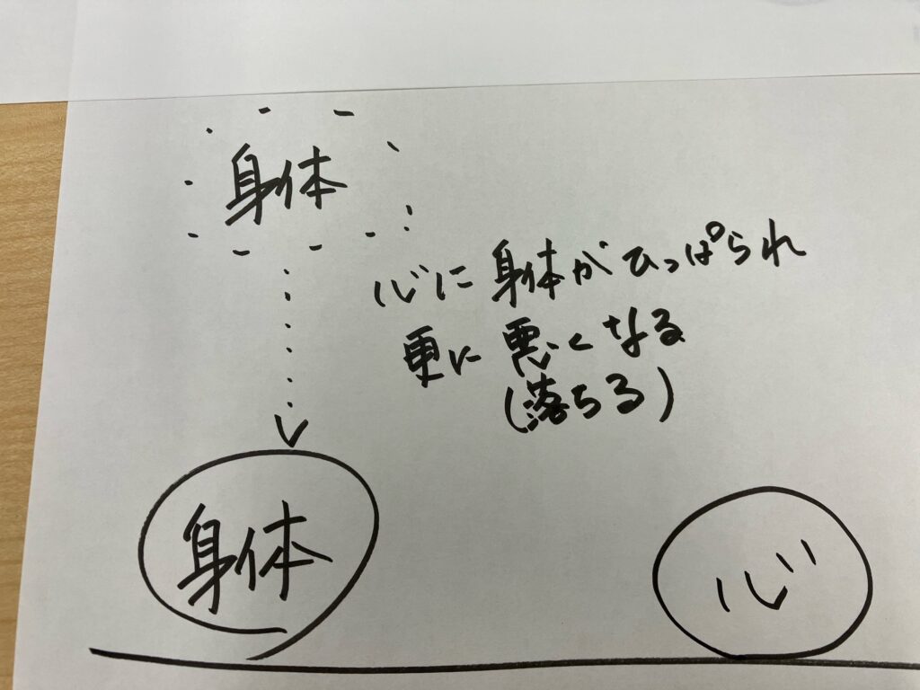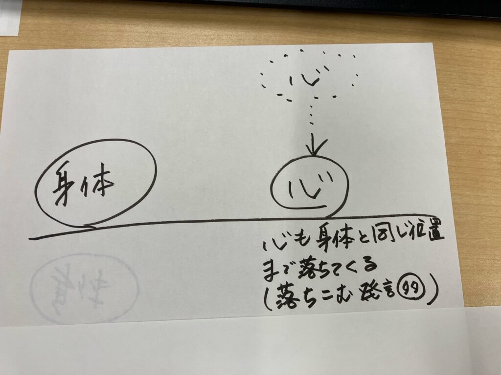 そうすると、今度か身体に引っ張られて、心が落ちていきます(落ち込む)