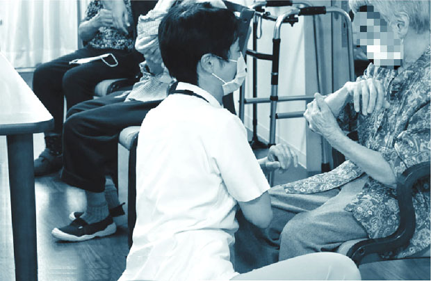 今回は、身体をしっかりと動かせる方から車イスをご利用の方まで、約20名にご参加いただきました。はじめに体操やストレッチで全身をほぐし、血流を促してから、脳トレやツボ押しに挑戦しました。